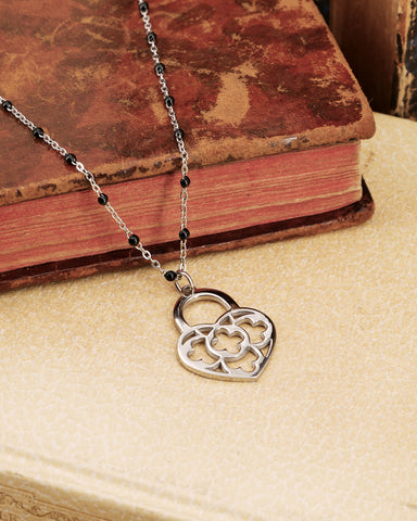 Collana corta con sfere nere in acciaio - Lucchetto cuore traforato